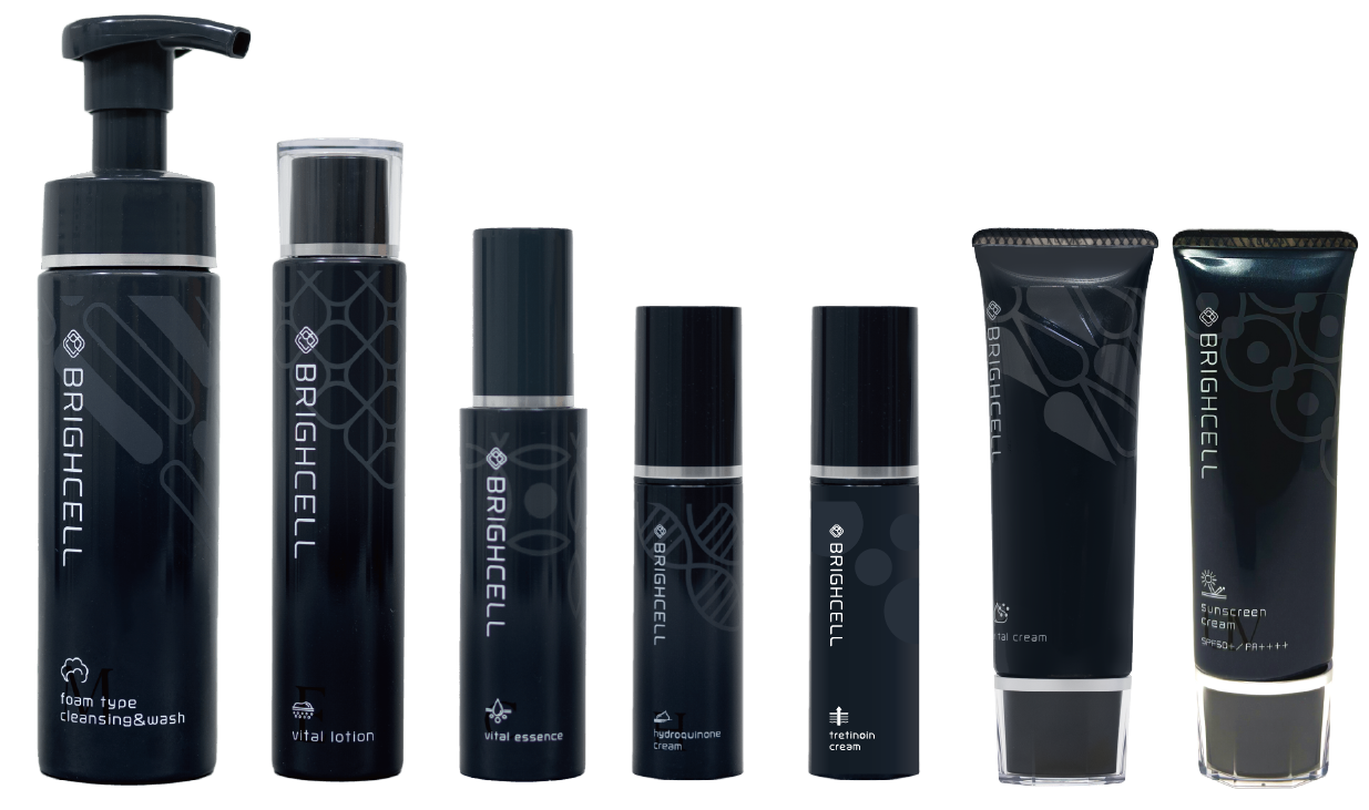 夜のスキンケアの最後に、医師が処方する「Rクリーム」(薄黄色のレチノイン酸クリーム )とブライトナークリームである「Hクリーム」(白色のハイドロキノンクリーム)を一緒にお使いいただき、あなたの肌に最適な強さに調整しながら、無理のないトレチノイン療法をおこなってください。